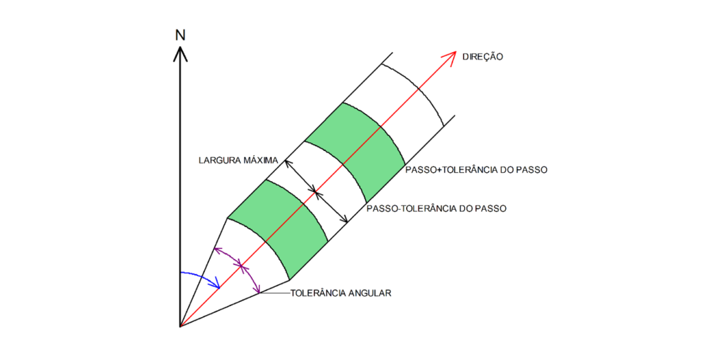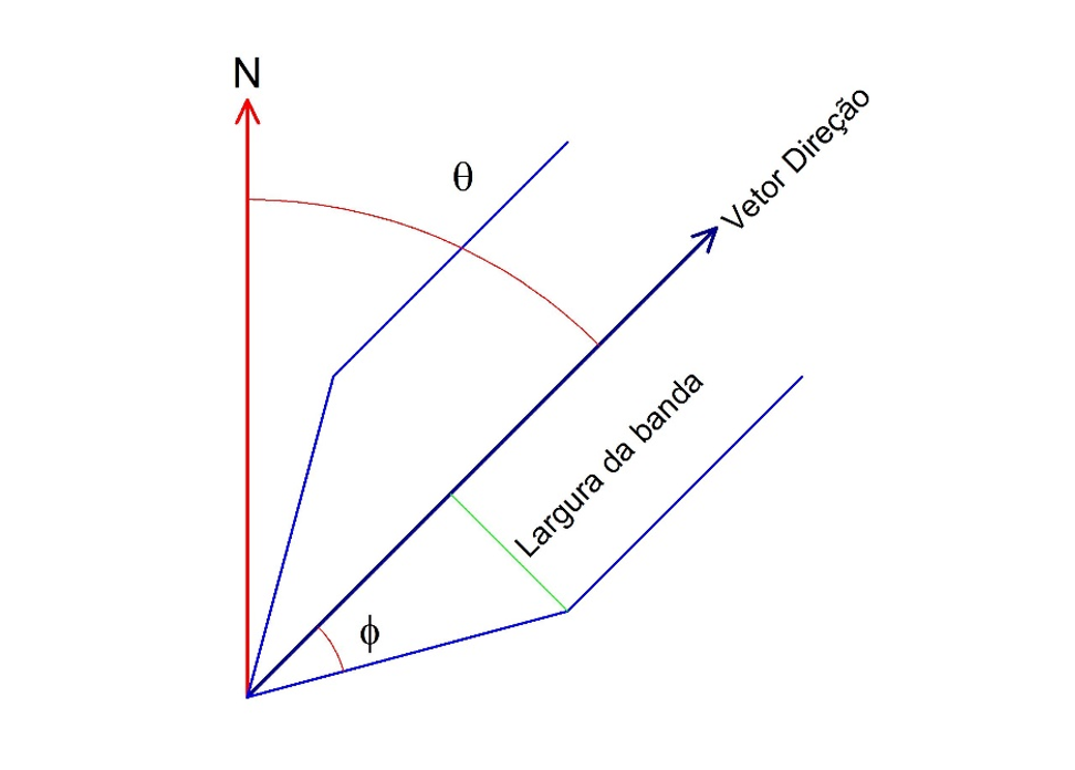 Para descrever o algoritmo de Remy et al. (2009), necessita-se definir os ângulos ϴ e Ф em graus, direção e tolerância angular, respectivamente e a largura da banda (Figura 2). A direção medida a partir do N no sentido horário (azimute) determina o vetor direção. A largura da banda é uma distância estabelecida para delimitar a pesquisa de pares de pontos e equivale ao raio da base do cone. O dispositivo geométrico é posicionado em um ponto de dado para localizar o outro ponto que forma o par de pontos que satisfaz os critérios estabelecidos em termos direção mais ou menos a tolerância angular e passo mais ou menos a tolerância do passo (Figura 2).