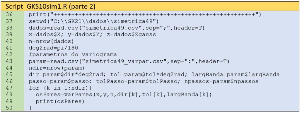 Neste artigo, oferecemos o Script GKS10sim1.R que permite calcular os pares de pontos de variogramas experimentais em duas direções (45 e 135º) para o conjunto de dados simetrica49.csv. Para executar o script, deve-se disponibilizar os arquivos de entrada: simetrica49.csv e simetrica49_varpar.csv (arquivo de parâmetros).