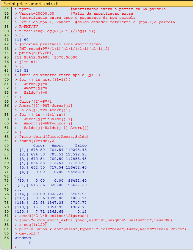A partir da 90ª prestação, o valor do PMT será igual a R$ 1370,36. Todos os cálculos podem ser efetuados através da execução do Script price_amort_extra.R. Para evitar repetição, as linhas 1-33 que são exatamente iguais ao script Price_PMT.T (artigo anterior) estão suprimidas. As modificações ocorrem após a linha 34, como se verifica a seguir. O script completo pode ser visto no link deste artigo. Nas linhas 34 e 35 são informados os dados da amortização extra. Nesse exemplo, ela ocorre após o pagamento da 5ª parcela, portanto npa=6 e o valor da amortização de R$ 20000,00. O melhor dia para se fazer uma amortização extra é sempre no dia do vencimento da prestação.