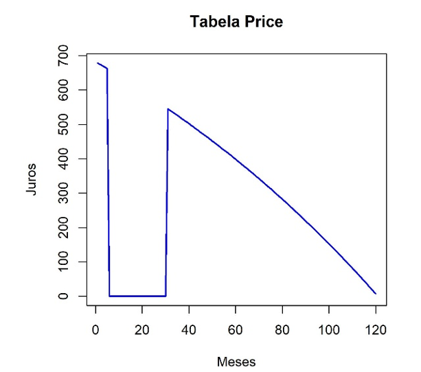 Entre as linhas 71-73, juros e amortização estão zerados e o saldo devedor é constante e igual a R$ 96452,20. A partir da 31ª prestação, os cálculos são retomados com base no novo PV (saldo devedor) e o novo PMT que é reajustado após a amortização extra. O gráfico dos juros pagos neste exemplo se encontra na Figura 2.