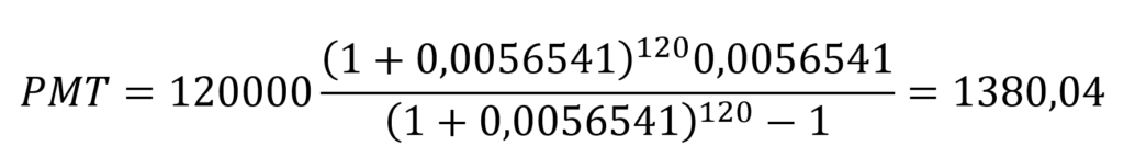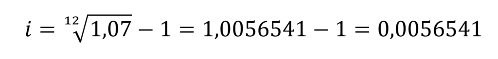 Por exemplo, toma-se um empréstimo de R$ 120.000,00 para ser pago em 10 anos com uma taxa de juros de 7% ao ano. A taxa de juros anual é convertida em uma taxa mensal, como segue: