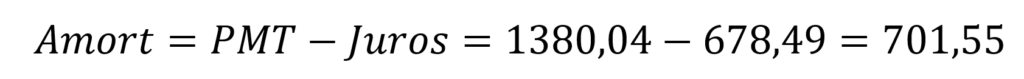 No segundo mês, o PMT é o mesmo, mas os juros calculados sobre o saldo devedor são menores que no primeiro mês, fazendo com que aumente a amortização. Dessa forma, tem-se os juros no 2º mês: