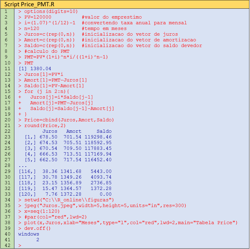 Feito isso, podemos passar à codificação do script para o cálculo da Tabela Price, conforme o script Price_PMT.R. A execução desse script apresenta no console os resultados a seguir: