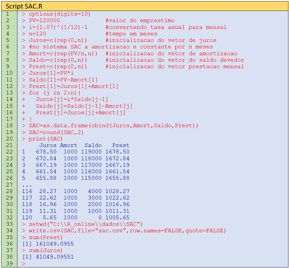 Nas linhas 5-9, faz-se a inicialização dos objetos Juros, Amort, Saldo e Prest. À exceção do objeto Amort, os demais são zerados no início. No Sistema de Amortização Constante (SAC), a amortização é igual a PV/n e válido para todos os n meses do financiamento. Os valores dos juros, saldo e prestação são calculados para o primeiro mês do financiamento (linhas 10-12). Em seguida, os demais valores são determinados no comando em laço das linhas 13-17.