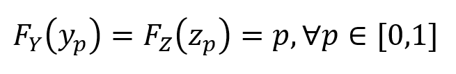 Sejam Z e Y duas variáveis aleatórias com funções de distribuições acumuladas FZ(z) e FY(y), então a transformada Y=ϕ(Z) identifica as probabilidades acumuladas correspondentes ao quantil p para Z e Y (Deutsch e Journel, 1992, p. 138):