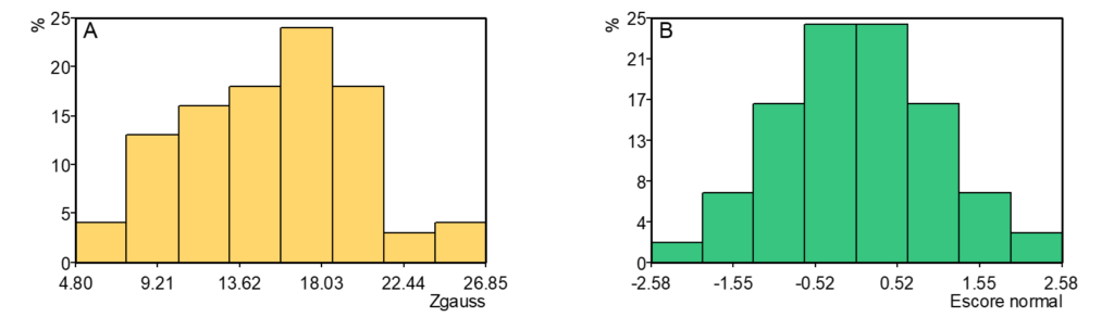 Segundo Deutsch e Journel (1992, p. 138), a transformada escore normal do k-ésimo valor de z(k) é o quantil k/n da função de distribuição acumulada normal: