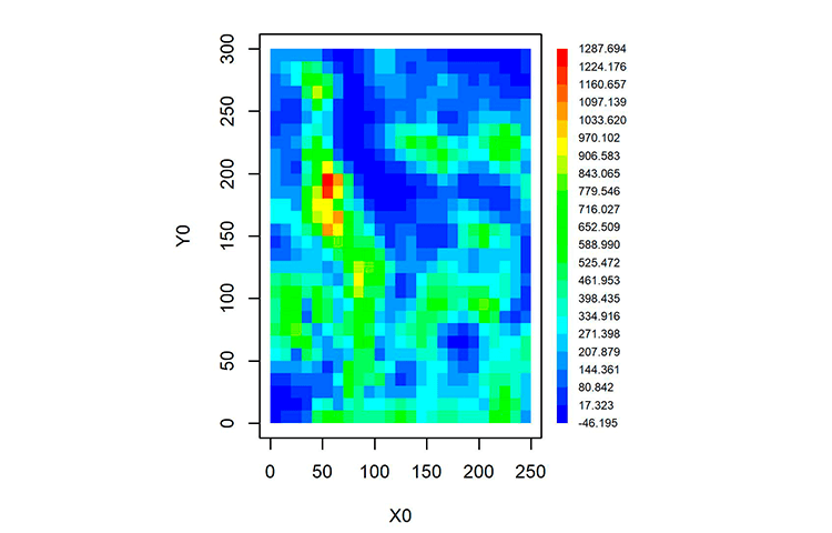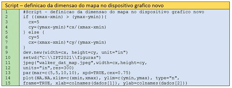 Os objetos cx e cy se destinam à definição das dimensões do mapa nos eixos X e Y, mantendo a proporcionalidade. Na linha 9, define-se um novo dispositivo gráfico com os valores calculados anteriormente (cx e cy) em polegadas. As linhas 11-12 estabelecem o dispositivo gráfico como sendo do tipo jpeg, com resolução de 300 pontos por polegada. Nas linhas 14-15, gera-se uma área de plotagem em branco, que irá receber o mapa imagem com a representação dos resultados da interpolação multiquádrica. A área de plotagem terá dimensões proporcionais a cx e cy.