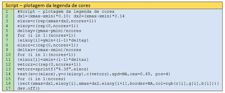 O último passo se refere à plotagem da legenda de cores, que é feita também como retângulos com os valores variando entre zmin e zmax. Verifique-se que toda a legenda é parametrizada em função dos limites do mapa. Os objetos eixox e eixoy armazenam (ncores+1) valores referentes às coordenadas x e y dentro da área de plotagem. Da mesma forma, vetorz armazena os valores da variável de interesse divididos em (ncores+1) intervalos. Na linha 14, os valores da variável de interesse são plotados nas coordenadas eixox e eixoy, respectivamente. Por fim, os retângulos são plotados nas linhas 15-16.