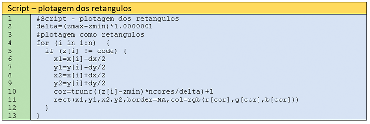 A representação em mapa imagem é feita por meio da plotagem de retângulos, os quais são definidos pelas coordenadas do canto inferior esquerdo e do canto superior direito (Figura 5). Agora, n se refere ao número de nós da malha regular, conforme sua leitura feita na linha 12 do Passo 6. As linhas 6-9 calculam as coordenadas necessárias para representação do retângulo (Figura 5). A cor é calculada como uma função que retorna valores sempre entre 1 e ncores. A variável delta que é a diferença entre zmax e zmin multiplicada por um valor muito próximo de 1, garante que sempre a cor irá variar entre 1 e ncores. Finalmente, na linha 11, faz-se a plotagem do retângulo.