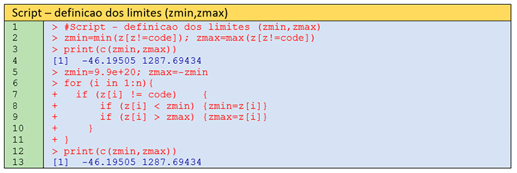 Esse script poderia se resumir apenas à linha 2, mas para fins didáticos se mostra as linhas 5 até 11, que têm o mesmo efeito da linha 2. A programação feita na linha 2 reflete a natureza orientada a objetos da linguagem R. Os limites são usados para representação do mapa imagem em termos das cores predefinidas anteriormente (Passo 5).