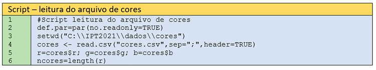 A linha 3 define o diretório no qual se encontra o arquivo cores.csv. Pede-se ao Leitor abrir esse arquivo em bloco de notas do tipo Notepad++. Poderia abrir no Excel, mas desde que a configuração regional estivesse definida com o separador decimal como ponto ao invés de vírgula. Ao abrir o arquivo, o Leitor irá verificar que os valores de R, G e B variam de zero a um. Isso porque no R, esses valores são normalizados. Para verificar os valores reais, basta multiplicar por 255.