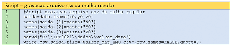 Neste passo, vamos gravar o arquivo da malha regular. Para isso, geramos um data frame (linha 2), conforme os nomes atribuídos nas linhas 3-5. A linha 6 direciona a gravação para um diretório predefinido. Solicita-se ao Leitor adequar o script para o diretório de seu computador. A gravação propriamente dita é feita na linha 7, sem a identificação das linhas e sem aspas duplas nos valores.