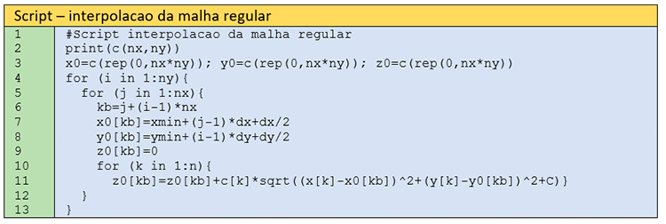 Neste script, a malha regular é interpolada, a partir dos parâmetros lidos do arquivo de parâmetros (walker_dat_par.csv). Este Autor convenciona usar as variáveis i e j para referenciar as coordenadas Y e X, respectivamente. Em apenas 10 linhas fazemos a interpolação de uma malha regular. A linha 3 gera os objetos x0, y0 e z0. Os dois primeiros irão armazenar as coordenadas X e Y. O terceiro serve para guardar o valor interpolado nas coordenadas (x0, y0). Observe-se que nas linhas 10-11, aplica-se a equação (1).