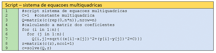 C é uma constante positiva e, segundo Franke (1982, p. 191), o método é bastante estável com relação à essa constante dando, consistentemente, bons resultados. Caso seja de interesse do Leitor, a teoria e aplicações da interpolação multiquádrica pode ser encontrada em Yamamoto (2020, p. 157-163).