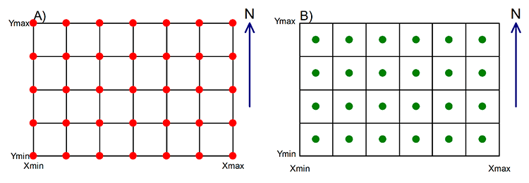 Para obtenção de um mapa como mostrado na Figura 1, deve-se definir o tipo de malha regular sobre os nós ou nos centros (Figura 2).