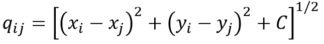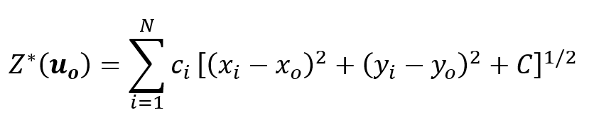 Neste caso, escolhemos o método das equações multiquádricas globais propostas originalmente por Hardy (1971, p. 1906). A forma geral da equação multiquádrica em 2D, segundo Hardy (1971, p. 1906):