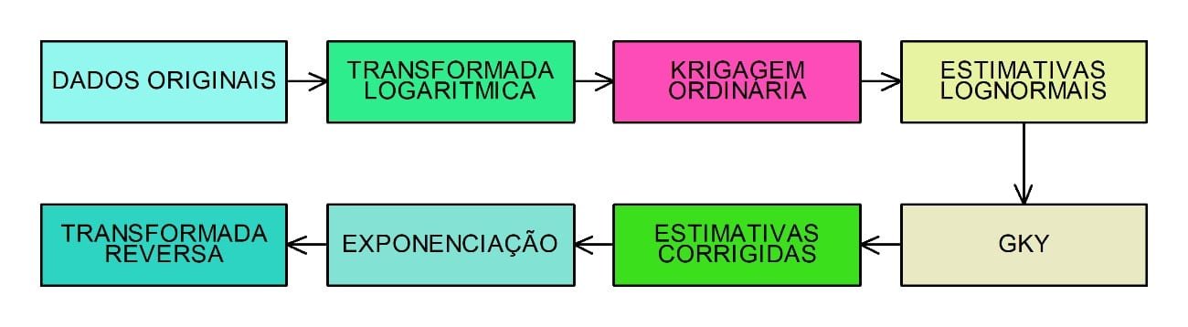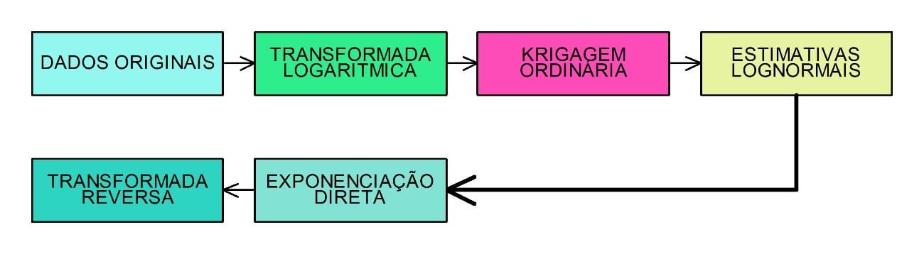 Podemos observar na seguinte imagem, o processo da krigagem lognormal com a transformada reversa por exponenciação direta.