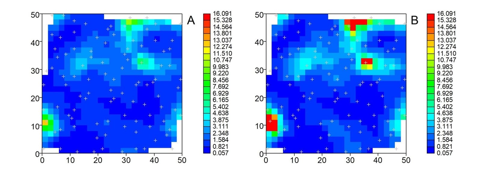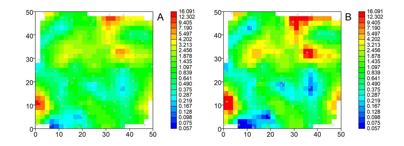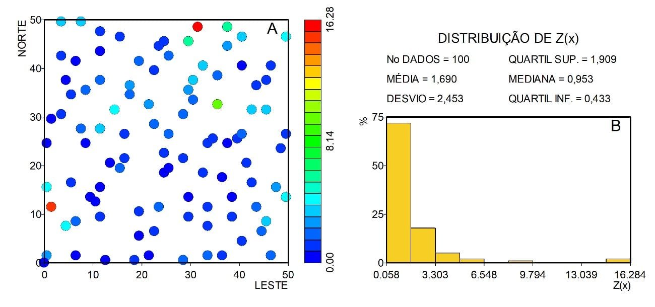 Para esta demonstração, considere-se uma amostra composta por 100 pontos de dados com uma distribuição lognormal, como podemos verificar na imagem abaixo. Trata-se de uma distribuição fortemente assimétrica, cujo coeficiente de variação é igual a 1,452. Portanto, este é o caso ideal para a aplicação da krigagem lognormal. Observe-se que os valores dos pontos foram classificados em escala aritmética, motivo pelo qual a maioria dos pontos se encontra nas classes inferiores.