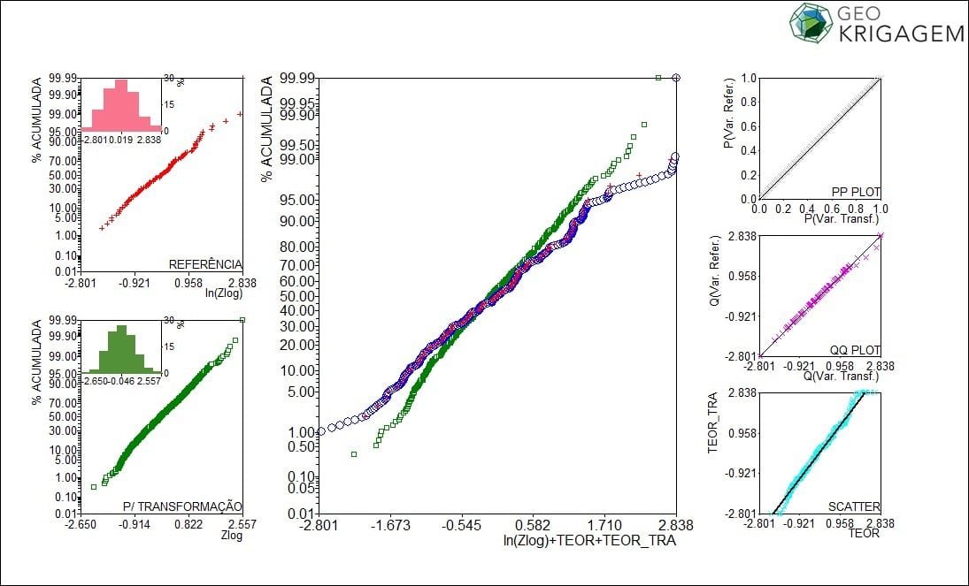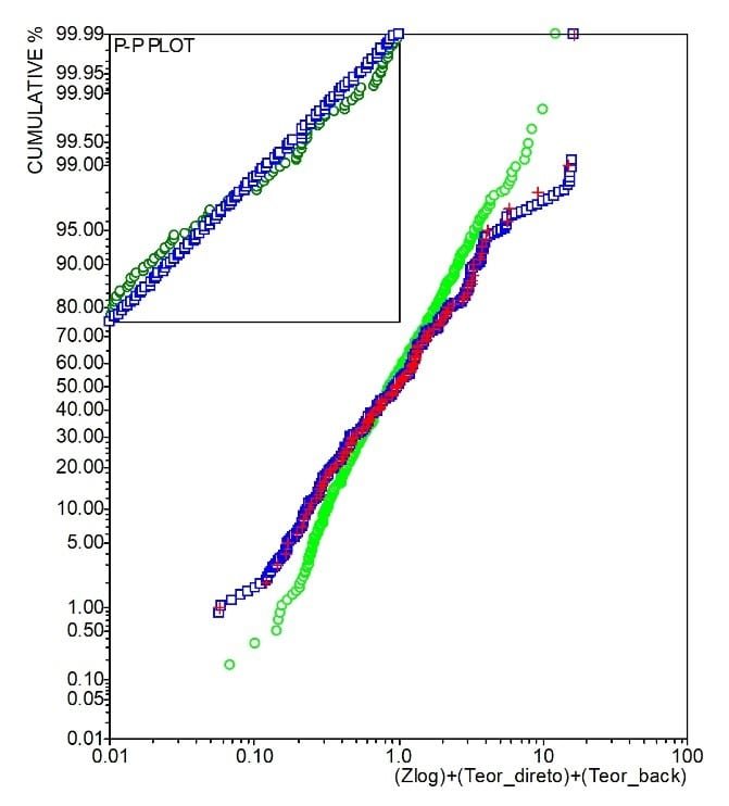 Nesta figura, pode-se observar que a transformação é quase linear, como mostram os gráficos à direita (PP-plot, QQ-plot e scatterplot), onde o PP-plot apresenta a compatibilização das distribuições de frequências (estimada em relação à amostral). Agora, os dados corrigidos são submetidos à exponenciação para obtenção da transformada reversa para a escala original dos dados amostrais, que podem ser comparados diretamente com a distribuição amostral (tabela e imagem abaixo).
