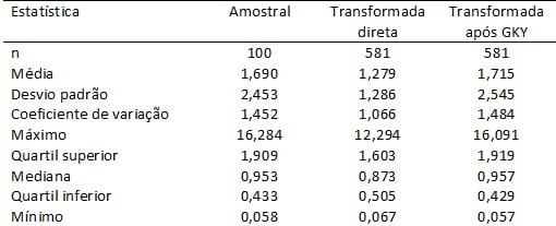 Comparando-se as médias da Tabela 1, verifica-se que o erro da transformada corrigida é de apenas 1,48%, que pode ser considerado muito bom, pois a distribuição é lognormal com um coeficiente de variação maior que 1,45. Por outro lado, o erro da transformada direta em relação à distribuição amostral é de 24,32%, que reflete a grande diferença entre as médias analisadas. Isso confirma a questão levantada por Journel e Huijbregts (1978, p. 572) em relação à grande diferença entre as médias. Cabe salientar que, na maioria dos programas comerciais, a transformação reversa é feita por exponenciação direta das estimativas lognormais.