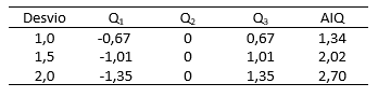 Conforme se observa na Tabela 1, a amplitude interquartil aumenta com o desvio padrão, ou seja, com o espalhamento da distribuição em torno da média.