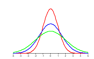 As estatísticas µ e σ definem a forma da distribuição normal ou de Gauss. Na realidade, µ e σ são os parâmetros da função densidade de probabilidade normal. Por definição, uma distribuição normal tem média igual a zero e desvio padrão igual a um. Quanto maior o desvio padrão σ, maior o grau de achatamento da curva. A Figura 2 ilustra algumas distribuições com desvios padrão iguais a 1,0, 1,5 e 2,0 e média constante igual a zero.