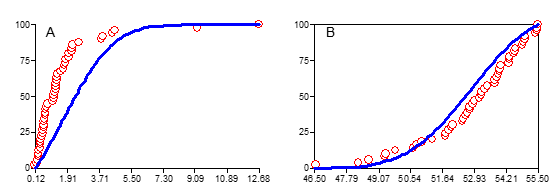 Figura 4: Curvas acumulativas e modelos normais ajustados para dados