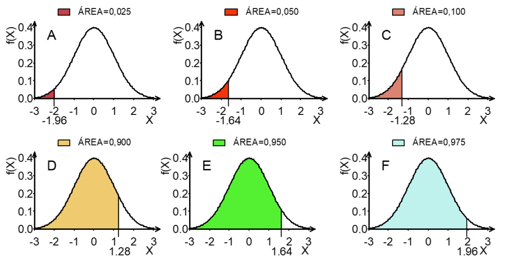 Essa equação pode ser usada para calcular as áreas sob a curva normal para os escores desejados. Por exemplo, a Figura 2 mostra as áreas calculadas para alguns escores normais, que significam as probabilidades de P(Z ≤ z). Esta expressão é usada para calcular as probabilidades acumuladas para a distribuição normal padrão.