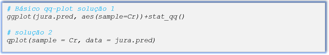 No nosso exemplo a seguir, usamos a variável Cromo (“Cr”) dos dados jura. O gráfico será projetado usando as duas funções que ggplot2 fornece: stat_qq () e qplot ():