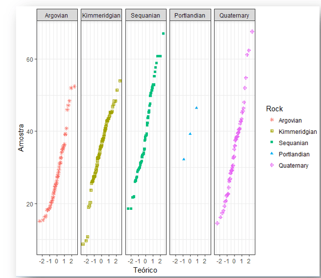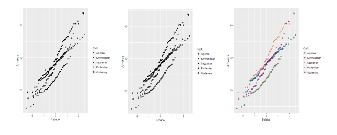 Lembre-se de que o ggplot2 descreve como alterar as formas dos pontos de um gráfico. Estes são controlados automaticamente pela variável “Rock” dos dados jura. A função scale_shape_manual modifica os pontos do gráfico. Da mesma forma, é possível alterar manualmente as cores do q-plot usando as funções: