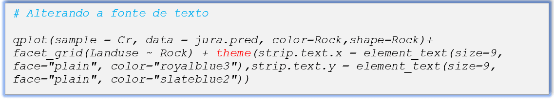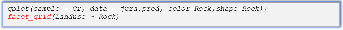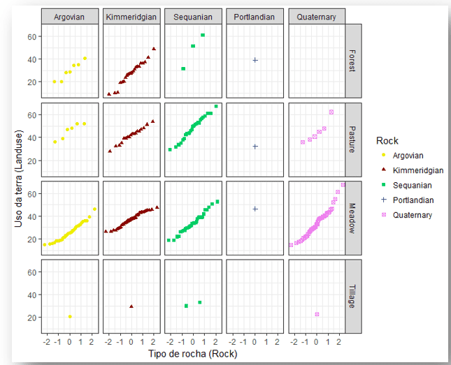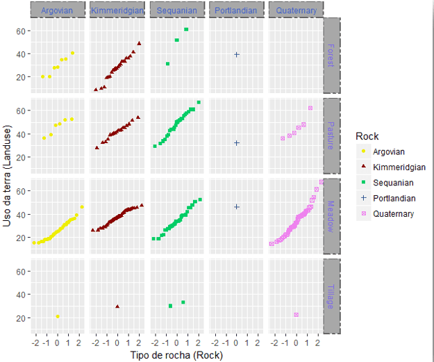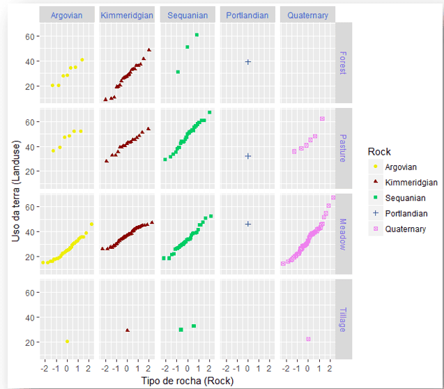 O comando facet_grid () executa a mesma função de dividir o gráfico em uma matriz de painéis. no exemplo a seguir, vamos ilustrar o argumento facet com as variáveis “Landuse” e “Rock”. O gráfico será dividido pelos níveis das duas variáveis: