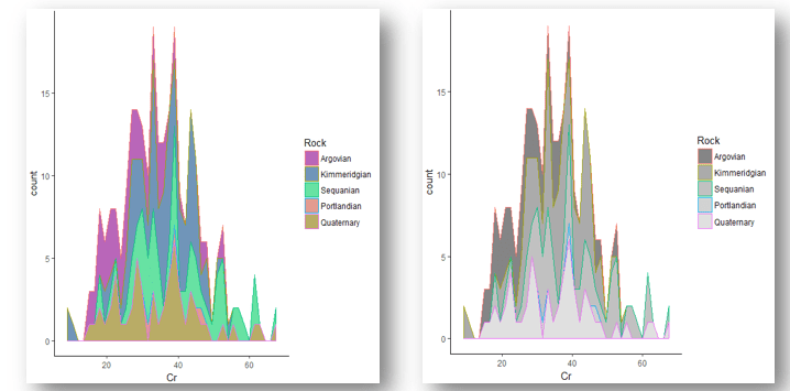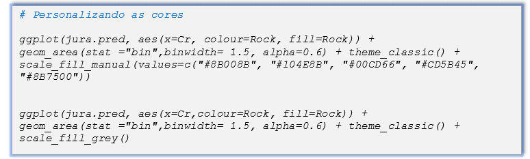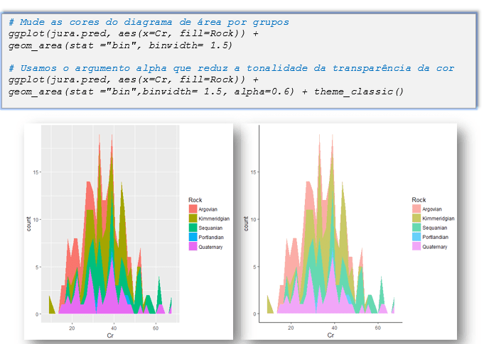Em nosso primeiro exemplo, usaremos os dados jura e a variável (Cr). A função geom_area será precedida por argumentos como o seguinte: