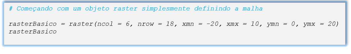 O pacote raster define um número de classes “class S4” para manipular o conjunto de dados presentes na malha regular. Existem três tipos de classes principais no pacote: RasterLayer, RasterBrick e RasterStack. Esses pacotes serão ilustrados neste tutorial mediante alguns exemplos. Além disso, o pacote contém, na sua estrutura, funções que permitem criar, ler, manipular e escrever dados geográficos, ou coordenados, no formato “raster”.