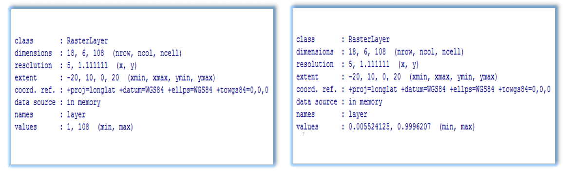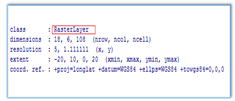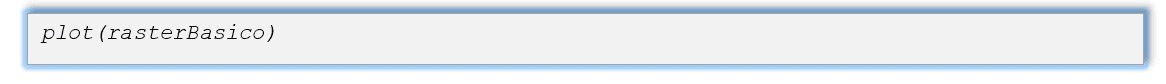 Um objeto de classe RasterLayer refere-se a uma camada única que armazena uma quantidade de parâmetros fundamentais que a descrevem. Nestes são incluídos o número de colunas e linhas, o sistema de referência de coordenadas CRS e a extensão espacial. No nosso exemplo, será gerado um exemplo básico de RasterLayer.