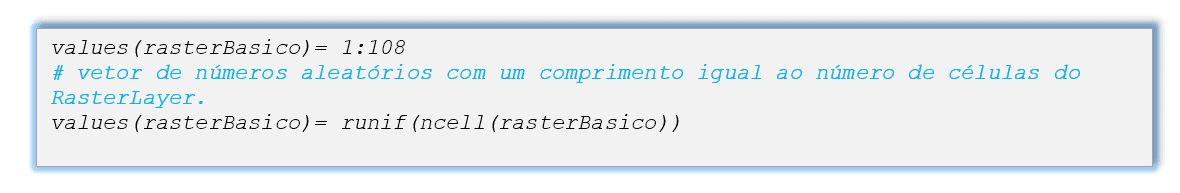 Como podemos observar, este conjunto de dados raster não possui valores associados. Nós atribuímos dados ao objeto raster usando a função values, como segue: