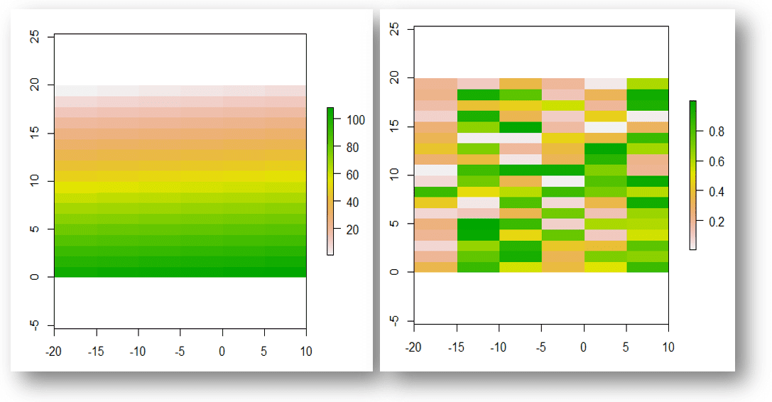 O raster gerado é plottado da forma usual usando a função básica plot. A seguir serão apresentados os gráficos do rasterBasico gerados pelos comandos anteriores.