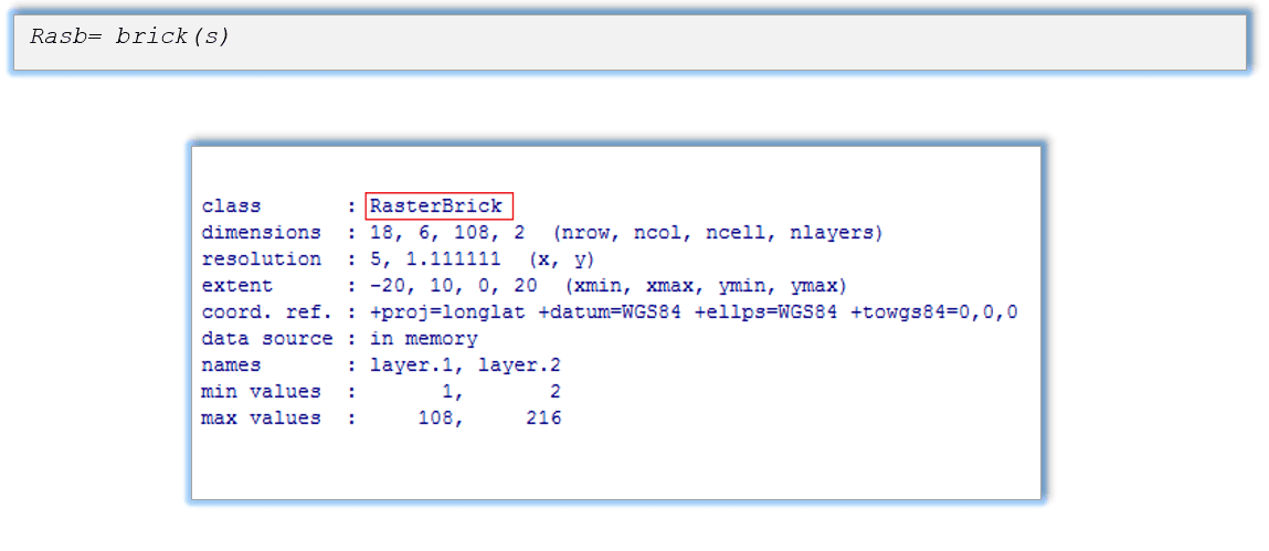 Um objeto da classe RasterBrick pode conter várias camadas de dados raster, mas a diferença entre um RasterStack é que o objeto desta classe se refere a um único arquivo de dados (multicamada). O processamento em um RasterBrick é mais eficiente do que um RasterStack. No entanto, um RasterStack facilita os cálculos baseados em pixels das diferentes camadas raster.