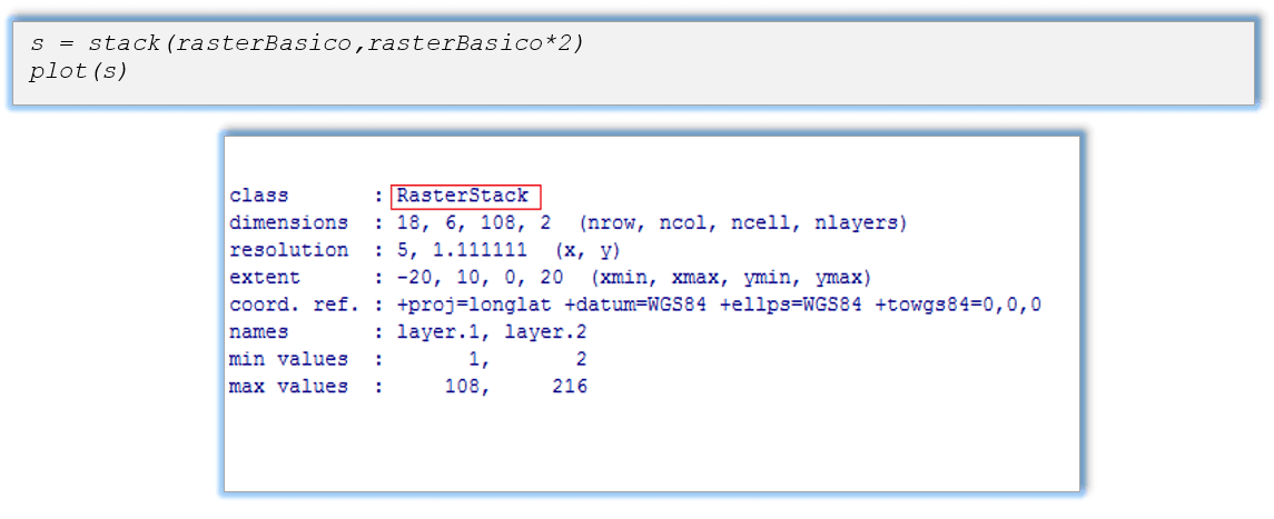 Um RasterStack pode conectar vários objetos raster escritos em arquivos diferentes ou na memória. No nosso próximo exemplo, vamos criar um RasterStack de várias camadas.