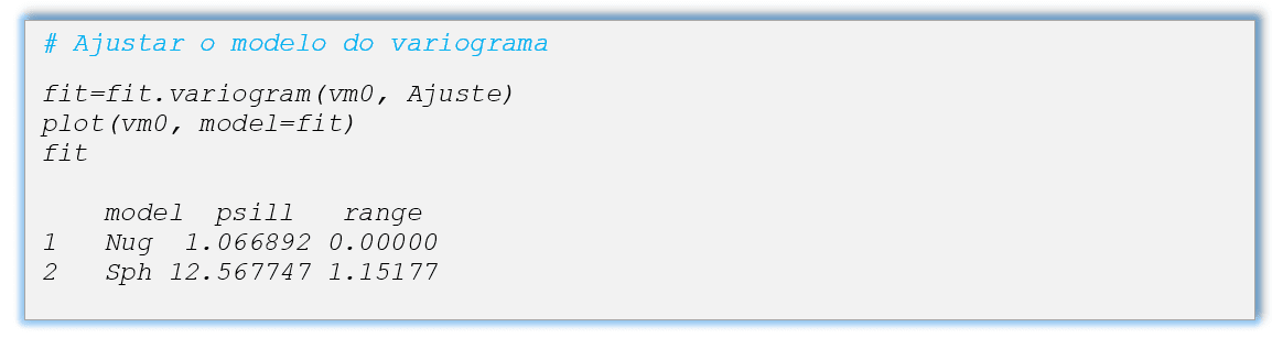 A função fit.variogram() ajusta os parâmetros do variograma do modelo esférico (Sph) ao variograma da amostra vgm1. A estrutura que você verá abaixo é muito semelhante ao da função vgm() e também é fornecido pelo o pacote gstat, para projetar o ajuste do variograma.