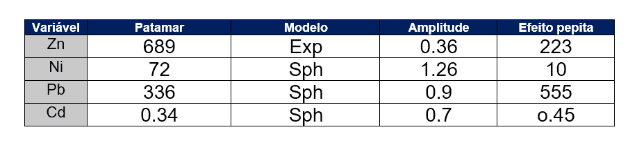 Usamos as variáveis (Zn, Ni, Pb e Cd) para projetar o variograma experimental e posteriormente ajustado com a função vgm().