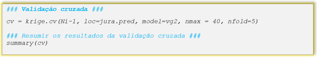 O pacote gstat utiliza a função krige.cv, que é usada para mostrar a técnica de validação cruzada. A seguinte estrutura ilustra os diferentes argumentos que essa função usa para seu posterior desenvolvimento.