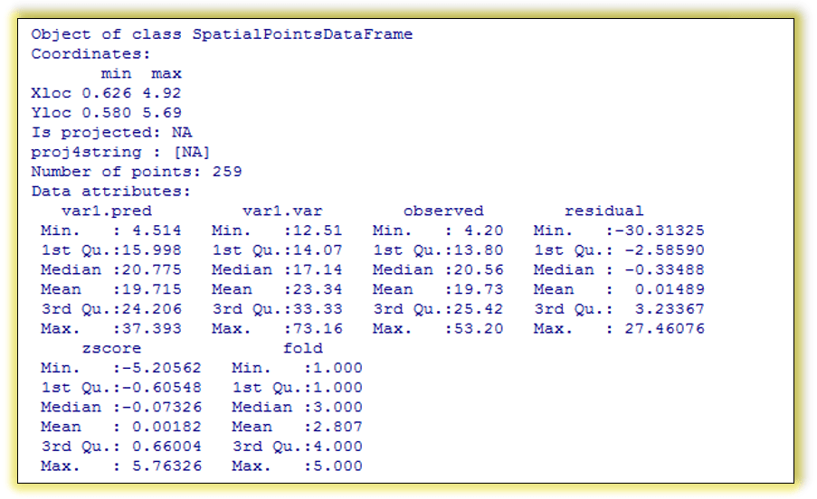 O spatial.points.dataframe retornado por krige.cv tem (var1.pred), a observação (observed) e sua diferença. (residual).