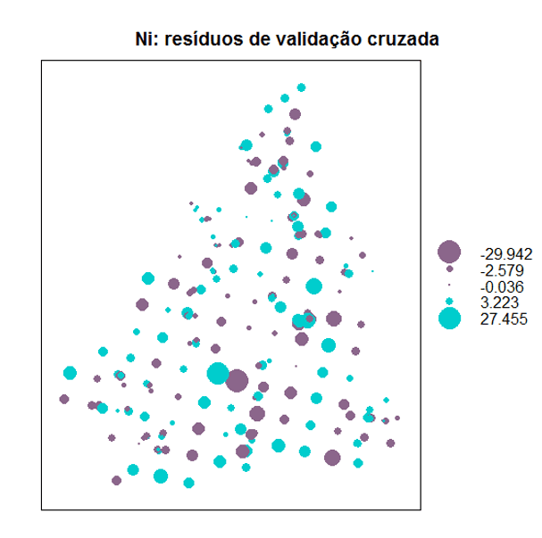 Para a solução de validação cruzada, é necessário calcular o variograma experimental e ser ajustado. Após a obtenção do ajuste do variograma, procedemos a desenhar avalidação cruzada. Para isso, usaremos os dados jura.pred e a variável Ni dos dados. Lembre-se de que os dados devem ser transformados em um SpatialPointsDataFrame.