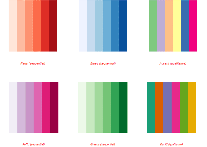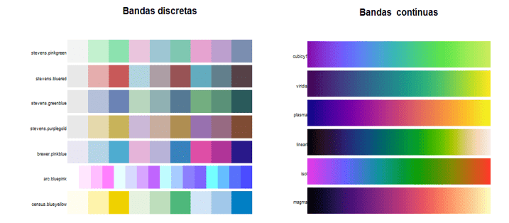 Se especificamos alguns dos nomes das paletas de cores mostradas no gráfico anterior, observaremos as tonalidades da paleta de cores, como segue: