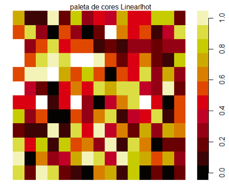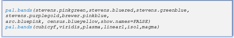 O pacote pals() tem como objetivo fornecer uma coleção completa de paletas e mapas de cores. As funções do pacote pals são , das quais em nosso tutorial iremos citar apenas duas. A função pal.bands() mostra as cores como bandas discretas formada por diferentes cores e uma banda de cores contínuas em degrade. A função heatmap() gera um mapa de cores aleatório com dos valores faltantes.