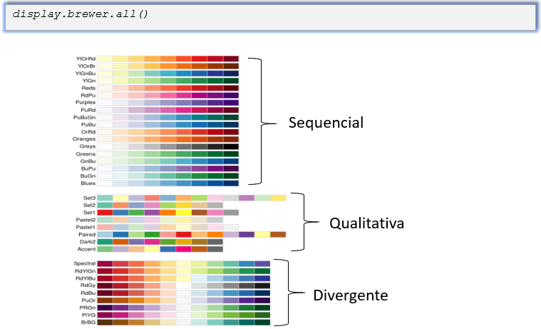 As paletas de cores usadas pelo pacote RColorBrewer podem ser visualizadas pela função display.brewer.all(). Estas cores são divididas em três grupos: sequenciais, divergentes e qualitativos.