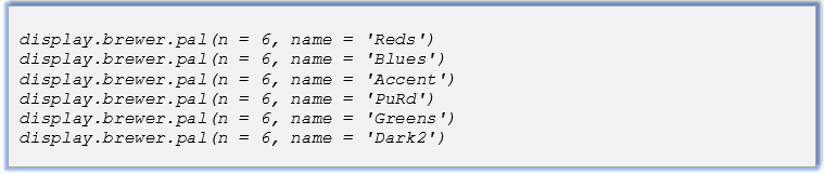 Para ilustrar as cores hexadecimais, é escolhido um nome da cor de preferência do pacote RColorBrewer.