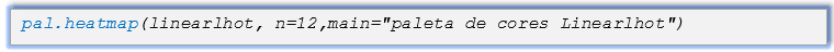O pacote pals() tem como objetivo fornecer uma coleção completa de paletas e mapas de cores. As funções do pacote pals são , das quais em nosso tutorial iremos citar apenas duas. A função pal.bands() mostra as cores como bandas discretas formada por diferentes cores e uma banda de cores contínuas em degrade. A função heatmap() gera um mapa de cores aleatório com dos valores faltantes.