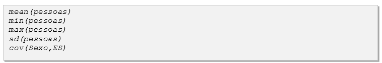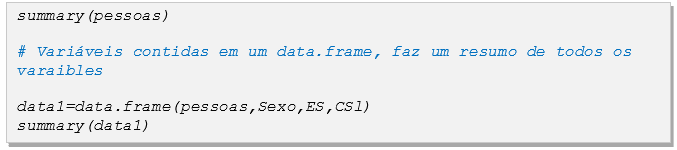 A função summary() fornece um resumo descritivo dos dados. Se é um vetor numérico, a função calcula o máximo, o mínimo, a média, a mediana e os três quartis dos dados. Se a variável é um fator, a função indica o número de observações em cada nível.