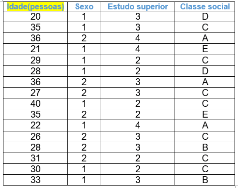 - A tabela a seguir mostra 16 pessoas da idade entre 20 a 40 anos, onde foram questionadas sobre sexo, nível de estudo superior e classe social.